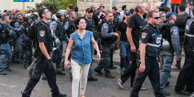 (Knesset Member Hanin Zoabi participates in protests in Haifa, 7-18-14)