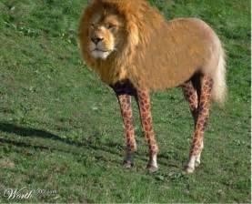 (Lion and Giraffe Mixture … Not Possible. This Is One of Those Superimposed Trick Photographs. No lion would pass up eating a giraffe in order to mate with it!)