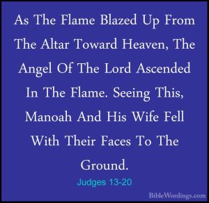 His wife wisely replied that if the Lord had intended to kill them he wouldn’t have accepted their offering. As with Gideon the Lord consumed their offering with fire, but also disappeared just like he did in front of Gideon.