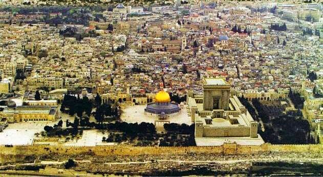 (Depiction of Rebuilt Temple Superimposed on an actual picture of Temple Mount, just to the right of the Dome of the Rock)