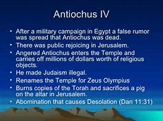Fulfillment: Alliances and wars between Syria and Egypt, culminating in Antiochus IV’s invasion of Israel, desecration of the rebuilt Temple, then opposition from some of God’s people who would resist this megalomaniac (Verse 32). Those who resisted and went on to defeat Antiochus and his superior army in the 160s B.C. were the Maccabees and their faithful Jewish followers.