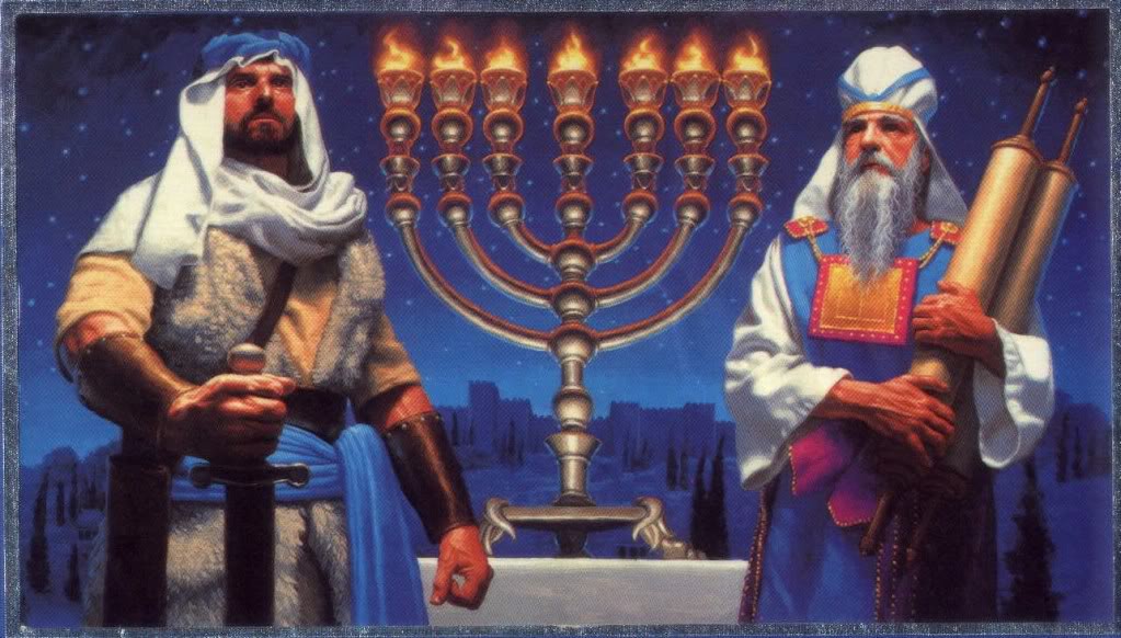 (Depiction of Judah Maccabee, the Menorah, and a Priest Holding Torah Scrolls … After the Amazing Victory over Antiochus IV and Recapture / Restoration of the 2nd Temple)
