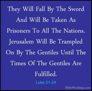 (The 1st sentence in this prophecy from Jesus took place when the Romans sacked Jerusalem in A.D. 70 which led to the Great Diaspora of the Jews. The 2nd half of this prophecy came to completion when Jerusalem was liberated by the IDF in the Six-Day War of 1967 … no more trampling of Jerusalem! Except for a few brief weeks during the Tribulation)